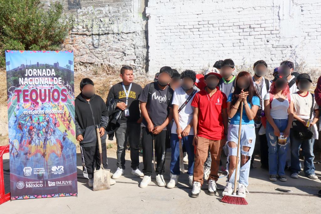 Jóvenes nicolasromerenses recuperan sus espacios deportivos con la Jornada Nacional de Tequios en Espacios Deportivos, convocada por el Gobierno de México.