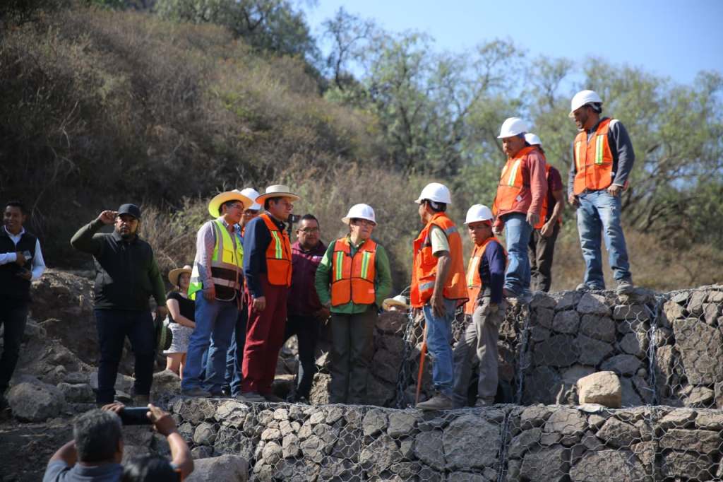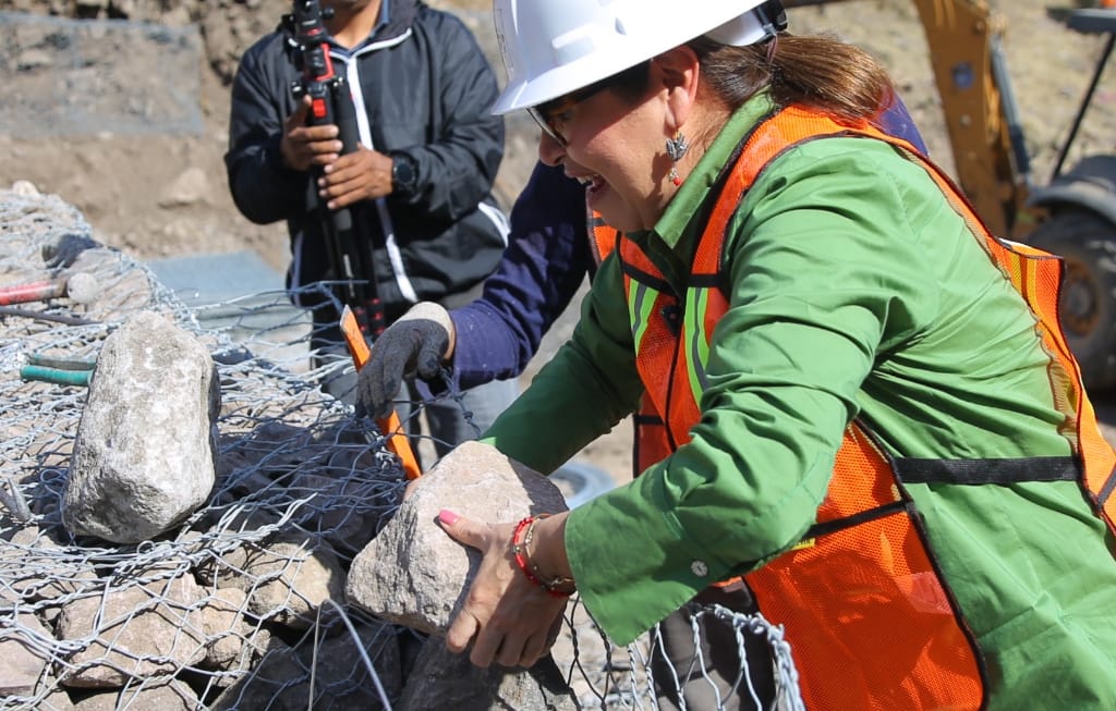 Azucena Cisneros supervisa mantenimiento en presa de gavión que retiene agua y sólidos, en donde hay cauces naturales y barrancas para evitar inundaciones en zonas bajas.