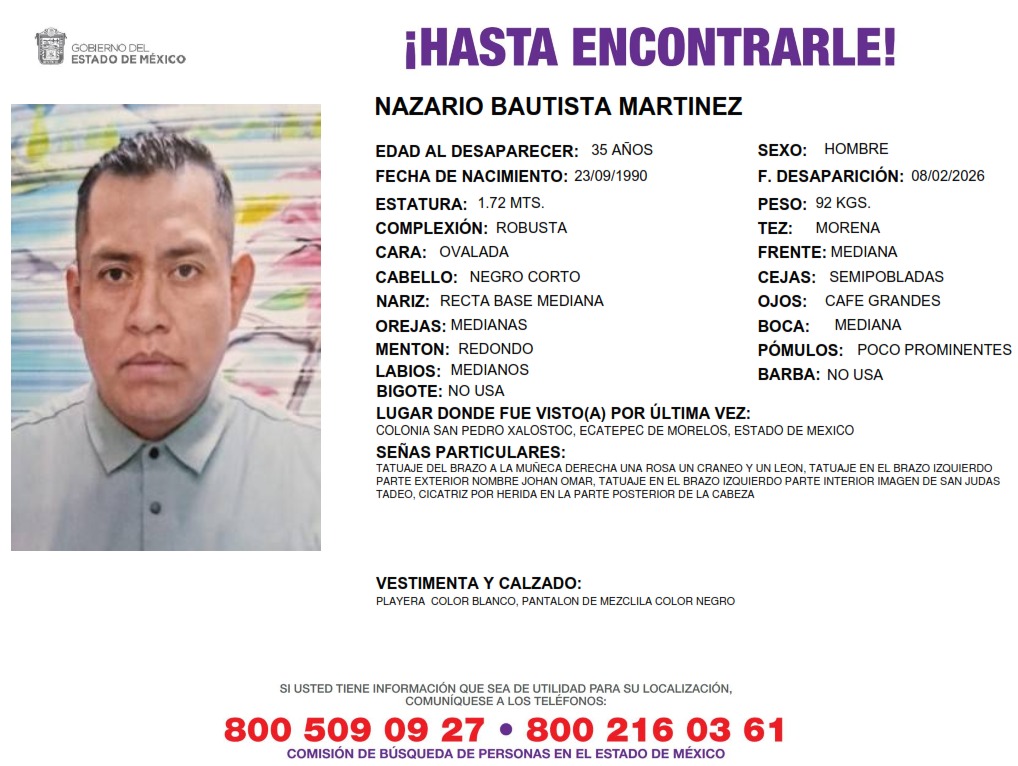 En tanto, que la Célula de Búsqueda de Ecatepec continua con el protocolo correspondiente para realizar acciones de difusión en busca de dar con el paradero de Nazario Bautista Martínez y en coordinación con las autoridades de Tlalnepantla.