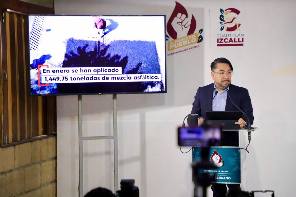 Cuautitlán, Izcalli, Méx.- Durante la conferencia semanal El Poder del Pueblo, el Presidente Municipal, Daniel Serrano, dio a conocer que tan solo en el mes de enero se aplicaron 1,449.75 toneladas de mezcla asfáltica en vialidades de diversas comunidades del municipio.