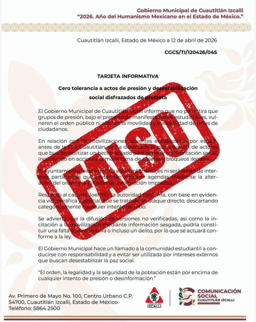 Cuautitlán Izcalli, Méx.- Respecto a la imagen de un texto que se difunde en redes sociales y que pretende hacerse pasar por una tarjeta informativa de este Gobierno Municipal –en la que se acusa que el movimiento de estudiantes de la FES Cuautitlán es ilegítimo–, este Ayuntamiento aclara que se trata de un texto apócrifo, que usa ilegítimamente los logotipos y nomenclatura de los comunicados oficiales, pero no es producto de una comunicación oficial de esta administración municipal.
