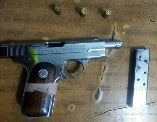 Acorde al protocolo, los Policías Estatales procedieron a la revisión preventiva al implicado y le encontraron un arma de fuego, tipo pistola, calibre .380, así como tres cartuchos percutidos esparcidos en el suelo.