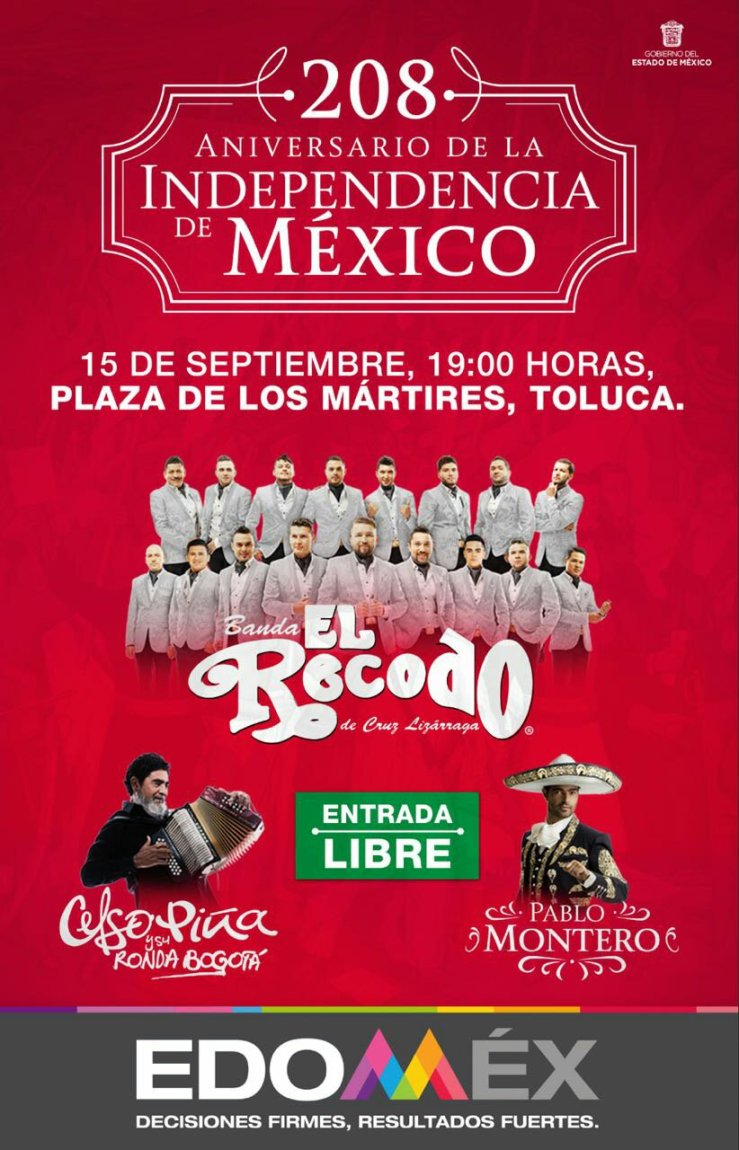 Toluca, Méx.- El Gobierno del Estado de México informa que el 208 Aniversario del inicio de la gesta de la independencia nacional será conmemorado con una verbena en la Plaza de los Mártires, con artistas de talla nacional e internacional.