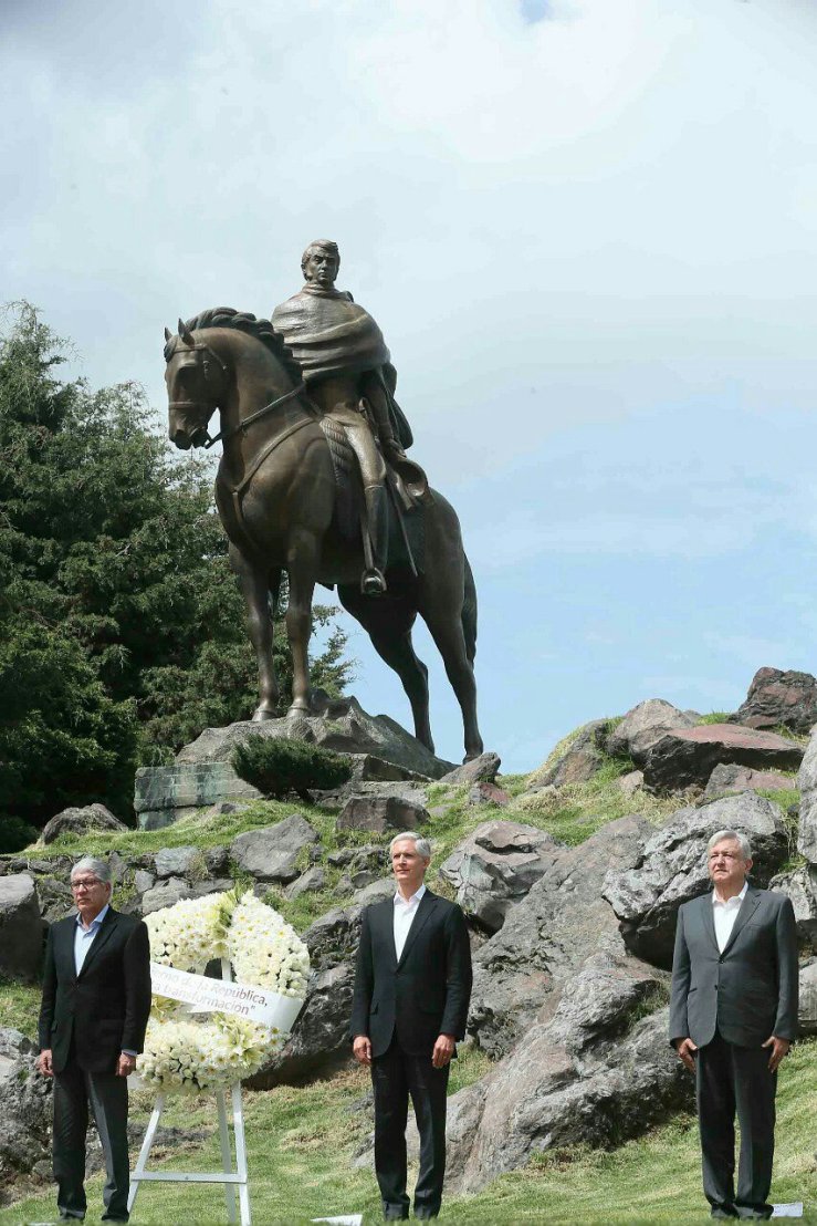 Ocoyoacac, Méx.- El Gobernador Alfredo Del Mazo Maza y el Presidente electo de México, Andrés Manuel López Obrador, montaron una guardia solemne en el Monumento Ecuestre de la Batalla del Monte de las Cruces, en Ocoyoacac, donde conmemoraron este histórico enfrentamiento militar ocurrido en 1810, entre el Ejército Insurgente y las fuerzas de la Corona española, donde Miguel Hidalgo y Costilla se alzó con la victoria.