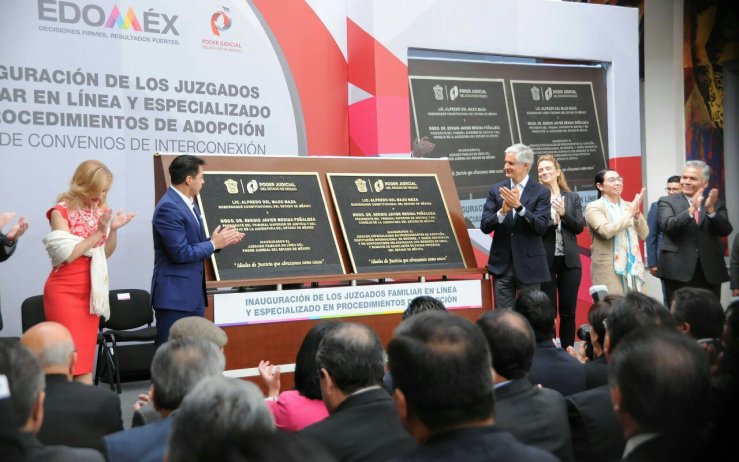 Toluca, Méx.- El Gobernador Alfredo Del Mazo Maza inauguró un Juzgado Especializado en Adopciones, el primero en su tipo a nivel nacional, y el Juzgado Familiar en Línea, además, atestiguó la firma de tres convenios de interconexión entre el Poder Judicial estatal y el Registro Civil mexiquense, el Instituto de la Función Registral del Estado de México (IFREM) y el Instituto de la Defensoría Pública de la entidad.