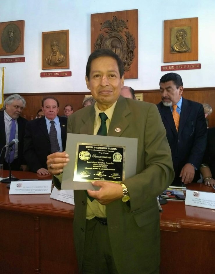 Reconocimiento entregado por el Club Primera Plana por 30 años de trabajo periodístico ininterrumpido. Juan Miguel Sánchez Argüelles http://www.diarioalmomento.com