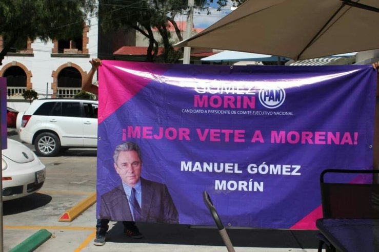 “Denuncian que se soltaron los demonios al interior del PAN de Hidalgo, simpatizantes de alguno de los tres grupos que apoyan a Marko Cortes, fueron a exhibir lona contra Manuel Gomez Morin, mientras se llevaba conferencia para presentar equipo de campaña del mexiquense en Hidalgo.