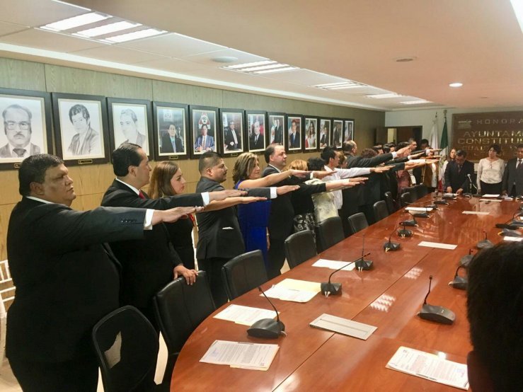 El acto protocolario encabezado por Víctor Estrada, alcalde saliente, se llevó a cabo en el Salón de Cabildos, quien estuvo acompañado por su cuerpo edilicio.