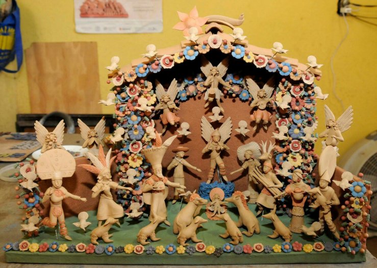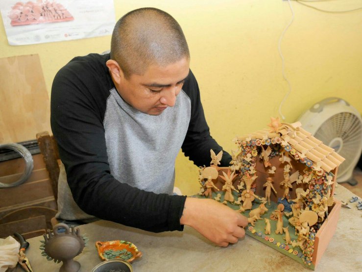 En un entorno tranquilo, rodeado de diferentes piezas de barro, Juan Manuel realiza, entre muchas otras piezas, extraordinarios nacimientos navideños, la mayoría de ellos en miniatura, que sorprenden por el detalle de sus minúsculas figuras de ángeles, vírgenes, reyes, animales y pastores, además de las pequeñísimas flores con las que decora el techo y todo el contorno del pesebre.