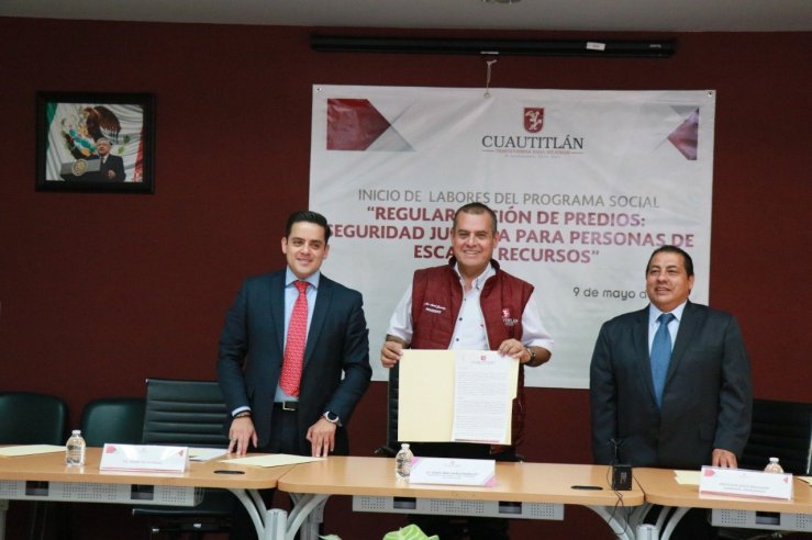 Cuautitlán, Méx.- El presidente municipal Ariel Juárez Rodríguez, signó un convenio para dar inicio al programa de Regularización de Predios: Seguridad Jurídica a Personas de Escasos Recursos, con el cual las familias con mínimos ingresos podrán realizar a bajo costo los trámites de regularización de sus predios en todo el territorio municipal.