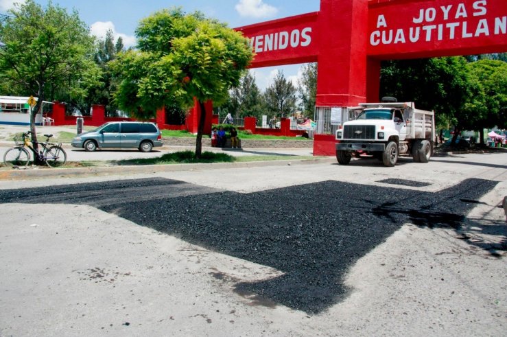 Cuautitlán, Méx.- La atención en el mejoramiento de las vialidades de las colonias y fraccionamientos permite agilizar el tránsito de los vecinos y la dotación de servicios, por lo que el gobierno municipal inició el bacheo del acceso principal del conjunto urbano Joyas de Cuautitlán, con el apoyo de los transportistas del municipio.
