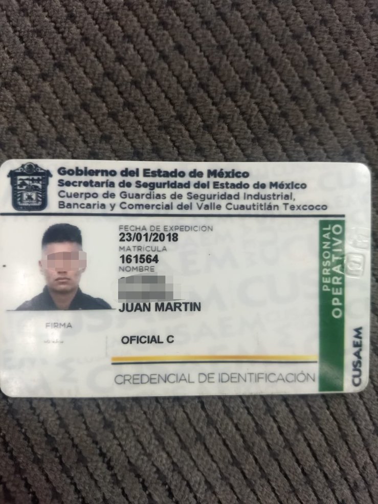 Juan Martín “N”, se identificó con un credencial de la Secretaria de Seguridad del Estado de México, de la división del Cuerpo de Guardias de Seguridad Industrial, Bancaria y Comercial del Valle Cuautitlán Texcoco, mejor conocido como (CUSAEM), la que al reverso especifica que: “Esta credencial no autoriza la portación de arma de fuego”.