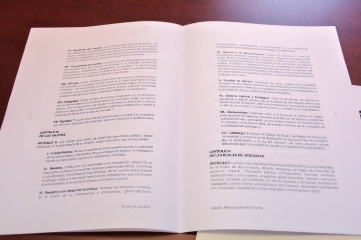 Expresó que el Código de Ética de la Administración Pública Municipal Centralizada de Tlalnepantla fue publicado el 31 de julio de 2019 en la Gaceta Municipal y cuenta con 6 capítulos y 11 artículos.