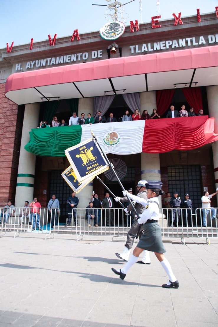 Tlalnepantla, Méx.- El Alcalde, Raciel Pérez Cruz, presidió el Desfile Cívico Militar Conmemorativo del 16 de Septiembre, en el marco del 209 aniversario del inicio de La Independencia, en el que participaron cinco mil 658 personas, 44 escoltas, 44 bandas de guerra, 56 vehículos, 104 patrullas, 8 unidades de bomberos y 10 caballos, que marcharon frente a miles de familias.
