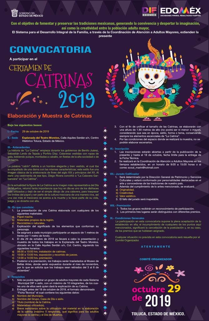 El DIF mexiquense recibirá antes del 18 de octubre la ficha técnica de los trabajos a concursar, misma que debe contener el nombre del municipio, del grupo, Casa de Día o asilo, título de la catrina, materiales utilizados (papel maché, propios de cada región, así como reciclables o naturales), una semblanza en cinco renglones sobre el uso del material usado en la elaboración de la catrina, así como lo que significa para los adultos mayores la catrina y el Día de Muertos.