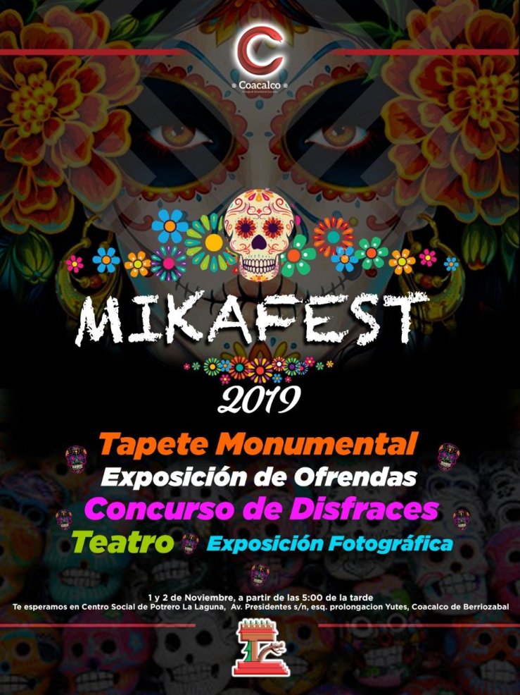 Coacalco, Méx.- En Coacalco, el Día de Muertos se vivirá en grande con la primera edición del “MikaFEST 2019”, evento en el que los visitantes podrán admirar un tapete monumental, ofrendas, una galería fotográfica, así como participar en un concurso de disfraces.