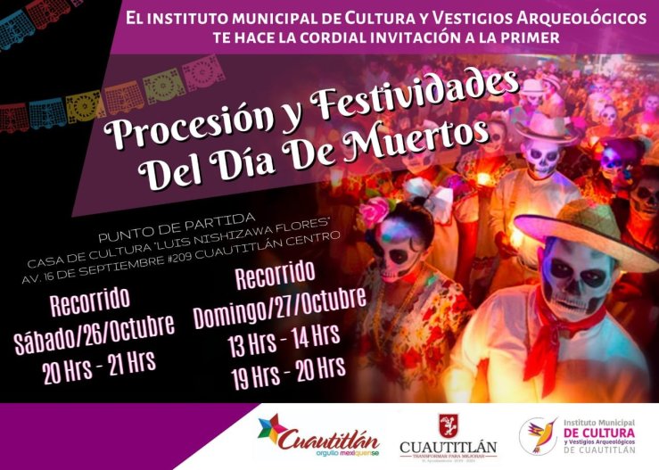 Como evento principal se realizará la 1ª Procesión del Día de Muertos, donde el público en general podrá participar, por lo que se les pide ir caracterizados de catrinas, los recorridos se realizarán los dos días antes mencionados a la 1 de la tarde y a las 7 de la noche, saliendo de la Casa de Cultura, caminando sobre las principales avenidas del centro urbano.
