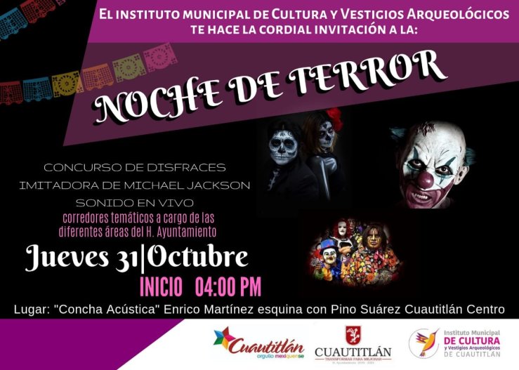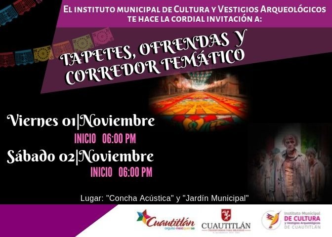 El 31 de octubre “La Noche del Terror” en la Casa de Cultura se presentará el concurso de disfraces; y el 1º y 2º de noviembre los visitantes y sus familias podrán apreciar la Exposición Temática de tapetes de aserrín y ofrendas tradicionales, en la Concha Acústica y Jardín Principal.