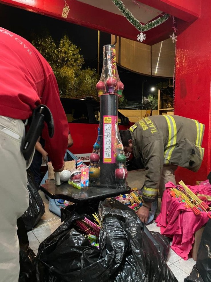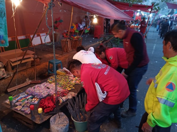 Personal de protección civil, seguridad pública, bomberos y verificación comercial pusieron en resguardo 80 kilogramos de material pirotécnico que se vendía de manera ilegal en puestos semifijos de la colonia Dr. Jorge Jiménez Cantú; con el apoyo de la Guardia Nacional, 140 kilogramos en San Andrés Atenco y Tlalnepantla Centro.