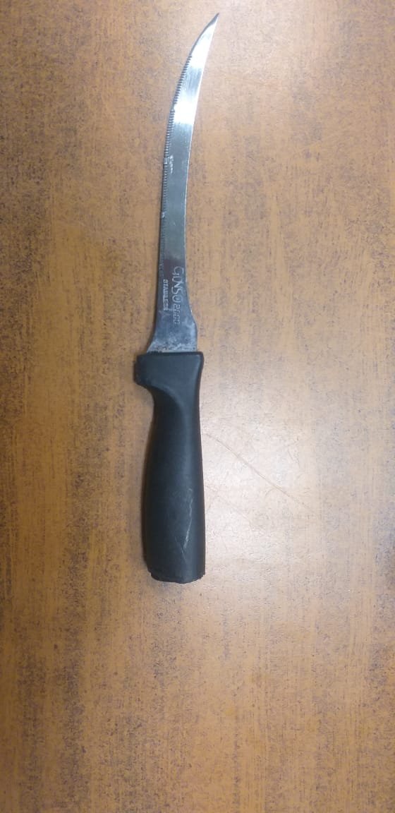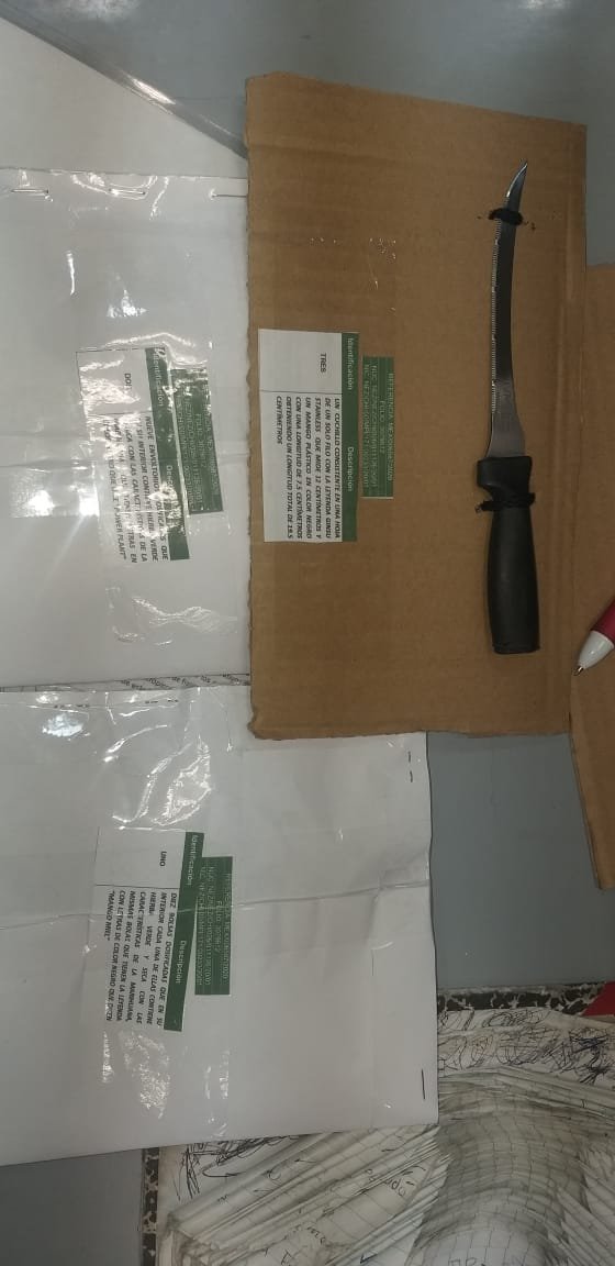 Mientras que el tercer detenido identificado como Martín “N” de 35 años, quien dijo tener su domicilio en la Ciudad de México, tenían en poder la bolsa internan del lado izquierdo de su chamarra color rojo, un cuchillo con la leyenda GINSU STAINLESS, de aproximadamente 19 centímetros de longitud total, el cual tiene una hoja metálica de un solo filo que mide 12 centímetros y un mango plástico en color negro con una longitud de 7centímetros.