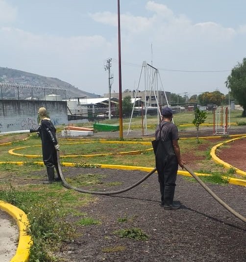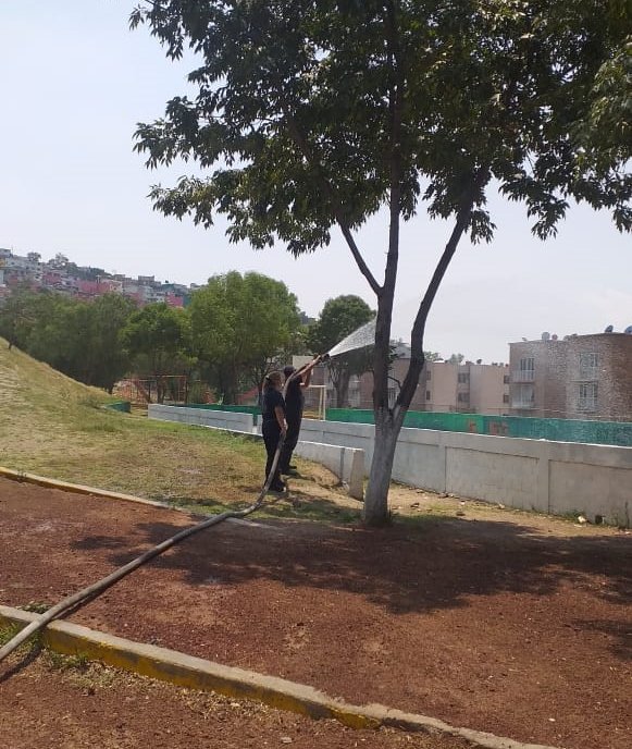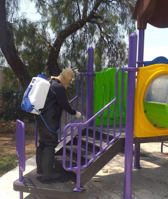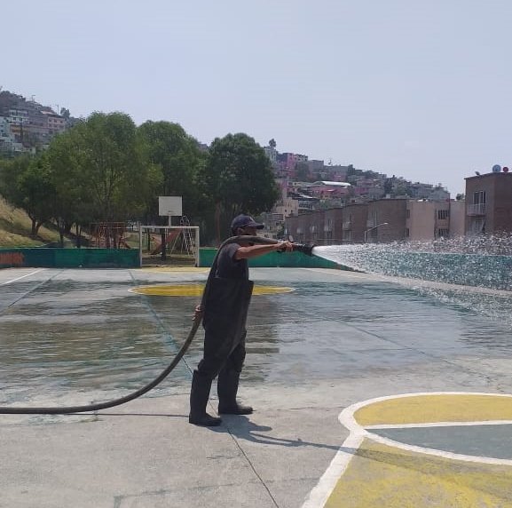 Personal operativo de la dependencia realizó la sanitización de calles y entradas de domicilios del fraccionamiento Valle del Paraíso, la colonia Marina Nacional, las calles Alpino Zirate, Cuauhtecutli y Unión Montañista Ferrocarrilera de Lázaro Cárdenas Primera Sección, el área deportiva y juegos infantiles de la unidad habitacional Bahía del Copal, Conjunto Habitacional Matamoros en Tlalnepantla Centro y las inmediaciones del Mercado del Carmen.