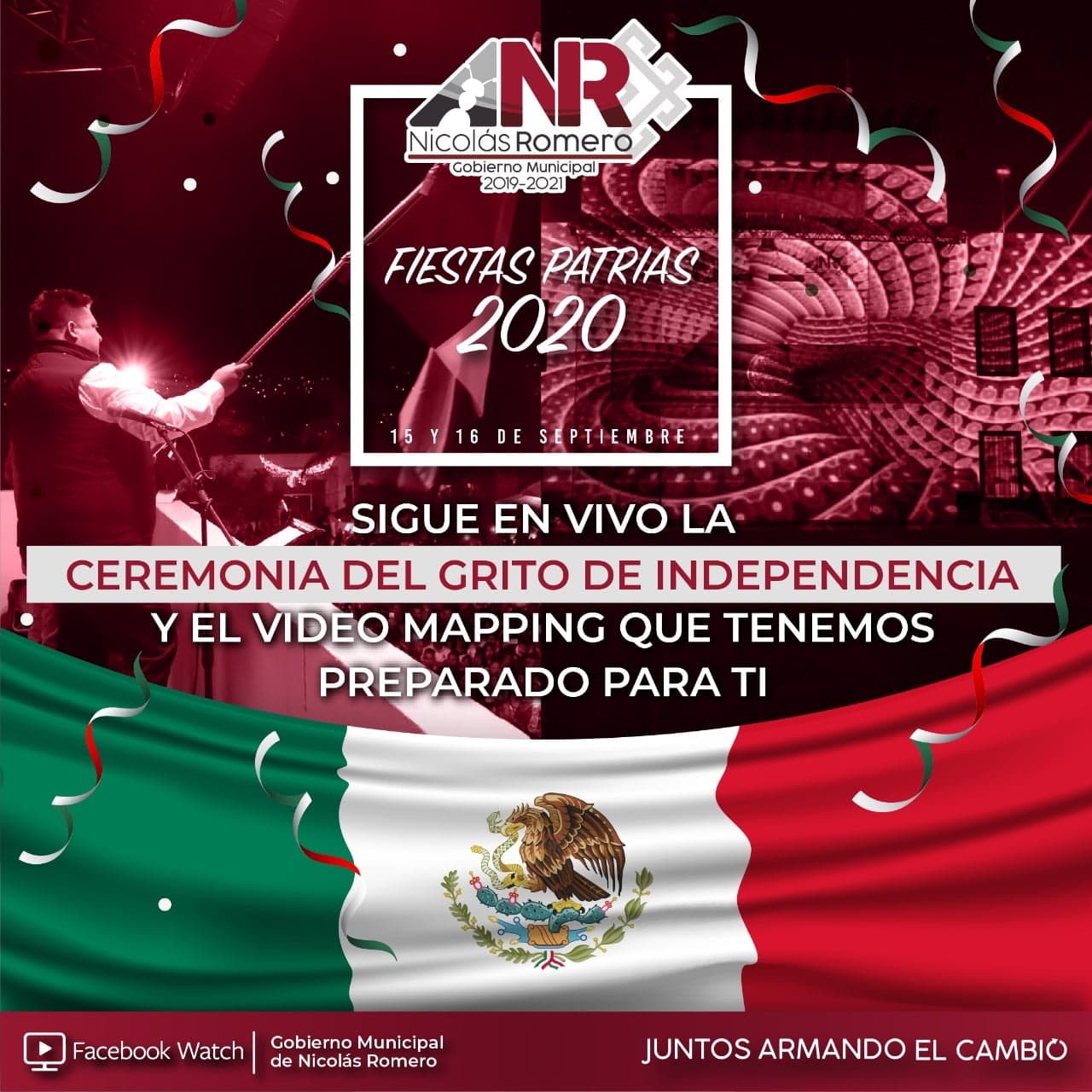 Además, tendrá lugar un espectáculo de video mapping que se proyectará en el Palacio Municipal, que igualmente será transmitido por la página de Facebook “Gobierno Municipal de Nicolás Romero,” así como una ceremonia cívica, que simbolizará la conmemoración de la gesta de los héroes que contribuyeron a que México, surgiera como una nación soberana e independiente, poniendo fin a la dominación española.