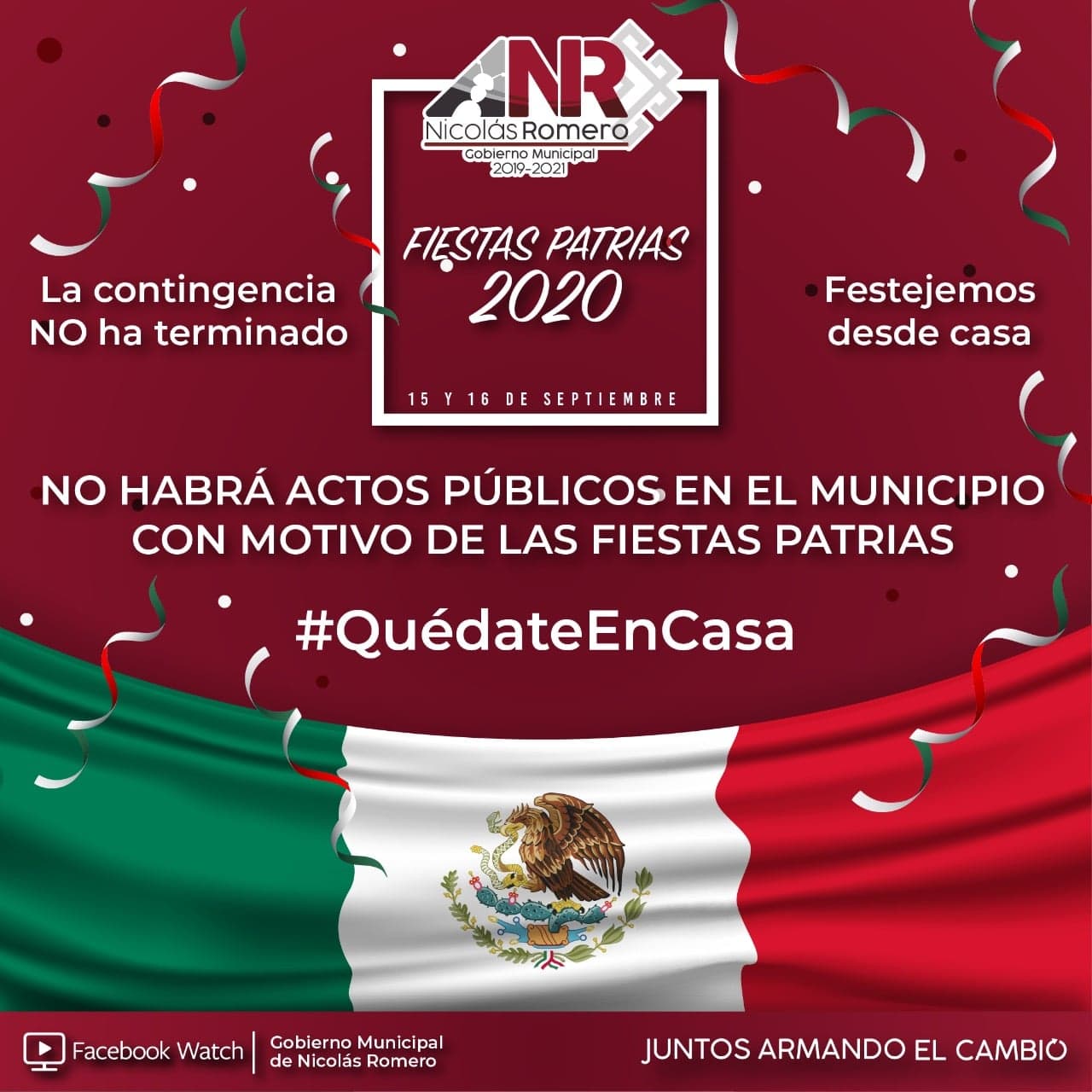 Nicolás Romero, Méx.- Ante la contingencia sanitaria por Covid-19, el gobierno del alcalde Armando Navarrete López, anunció que no se llevarán a cabo eventos masivos con motivo de los festejos patrios, ya que proteger la salud de los nicolásromerenses es una prioridad para la actual administración.