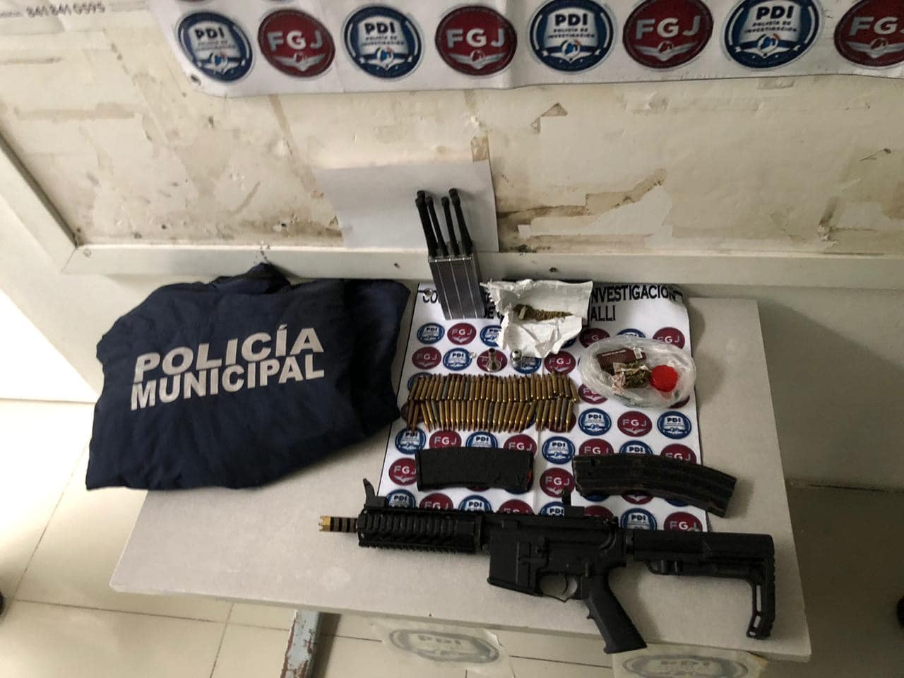 Una vez que la orden de cateo fue otorgada, personal de la Fiscalía General, quien contó con el apoyo de elementos de la Guardia Nacional, de la Policía Estatal y de Seguridad Pública Municipal, mismos que brindaron apoyo perimetral, se trasladó al sitio en donde fue asegurado lo siguiente: Envoltorios con hierba verde con las características de la marihuana; Un arma de fuego, tipo fusil calibre .223 mm; 58 cartuchos útiles calibre .223 mm; Un cargador para arma de fuego; Un inhibidor de señal de seis antenas; Una chamarra con insignias de la Policía Municipal de Huehuetoca.