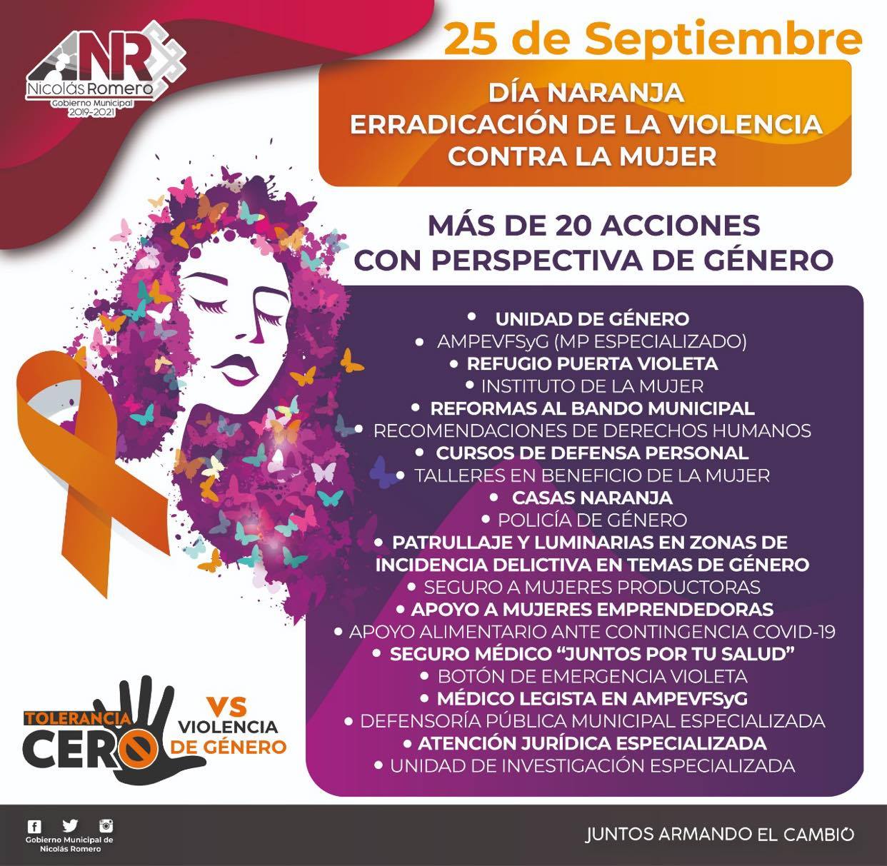 En el marco del Día Naranja, que se conmemora cada 25 de mes, el presidente municipal señaló que en Nicolás Romero la mujer es prioridad, por lo que dentro del esfuerzo para garantizar que tenga una vida sin agresiones, la demarcación fue la primera en la entidad mexiquense en realizar reformas su Bando Municipal, para establecer severas sanciones en contra de quienes atenten contra las féminas.