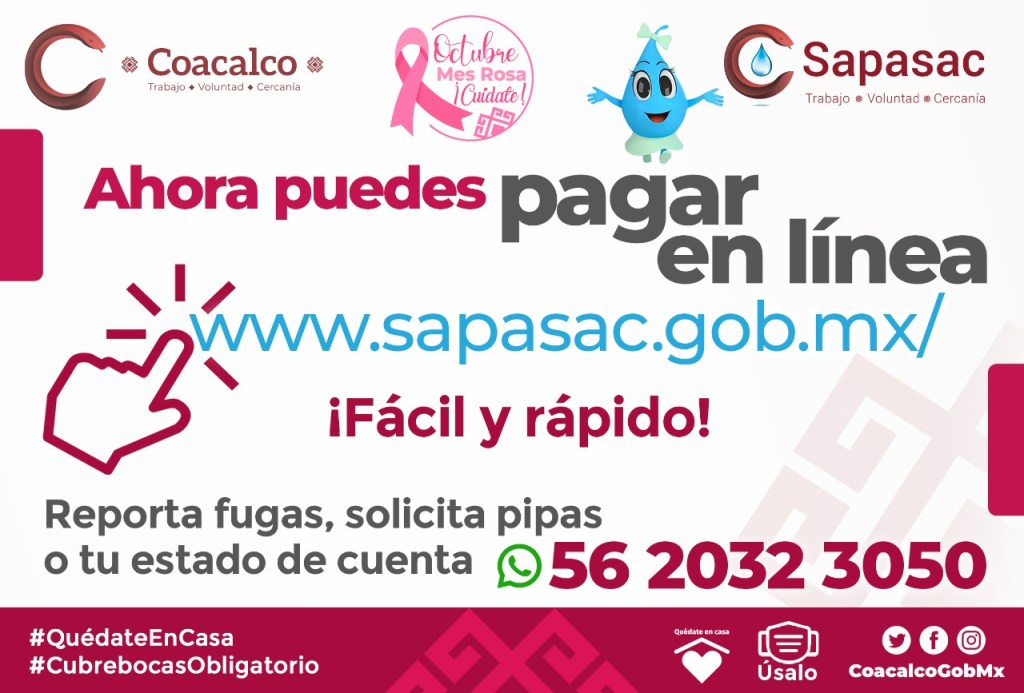 Coacalco, Méx.- Para facilitar a la ciudadanía su pago por el servicio de agua potable y evitar que tengan retrasos en el mismo, el organismo descentralizado de agua de Coacalco (Sapasac) habilitó el sistema de pago en línea, a través del portal http://www.sapasac.gob.mx