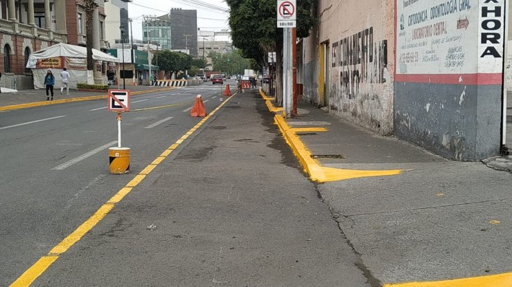 Cuadrillas de trabajadores de la Dirección de Servicios y Mantenimiento Urbano realizaron el balizamiento del carril exclusivo de los ciclistas, con el fin de delimitar el espacio para que no lo invadan los conductores de automóviles, transporte público y de carga.