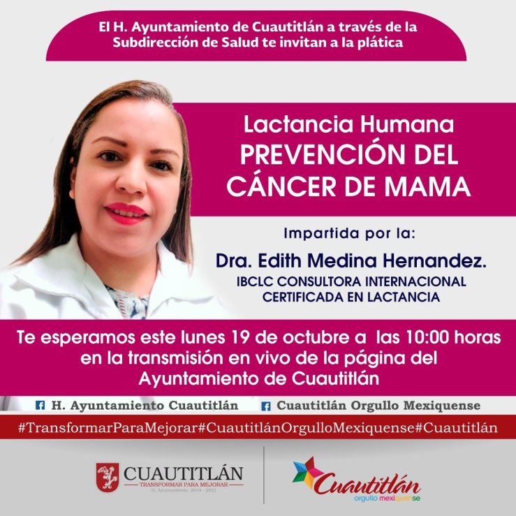 En el conjunto urbano La Alborada, se llevó a cabo la jornada de mastografías gratuitas, en coordinación con el Instituto de Salud del gobierno estatal, beneficiando a 137 vecinas, además se impartirá una plática de manera virtual a través del Facebook de Ayuntamiento de Cuautitlán, titulada: Lactancia humana como prevención del cáncer de mama, por la especialista Dra. Edith Medina Hernández, Consultora internacional certificada en lactancia IBCLC.