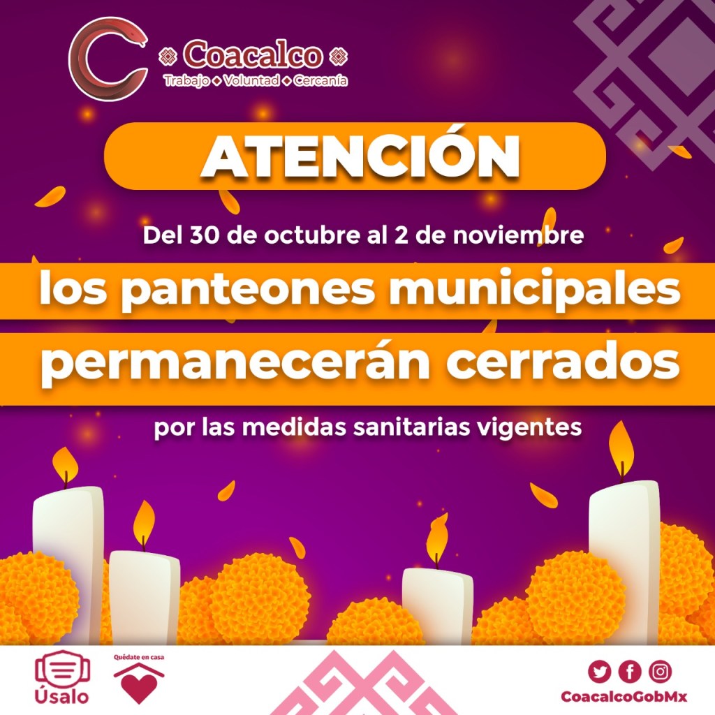 Coacalco, Méx.- Con la finalidad de prevenir la propagación del virus del COVID-19 y procurar la salud de los ciudadanos, el Gobierno de Coacalco que preside el Alcalde Darwin Eslava anunció el cierre de los panteones municipales, del día 30 de octubre al 2 de noviembre.