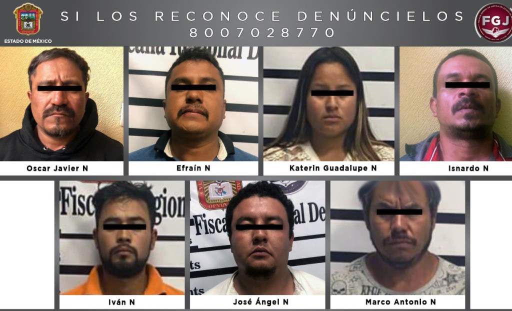 Los detenidos fueron identificados como Oscar Javier “N” de 35 años de edad; Isnardo “N” de 35 años; Efraín “N” 36 años; Marco Antonio “N” de 41; Iván “N” de 28 años; José Ángel “N” de 27 años y Katerin Guadalupe “N” de 19 años.