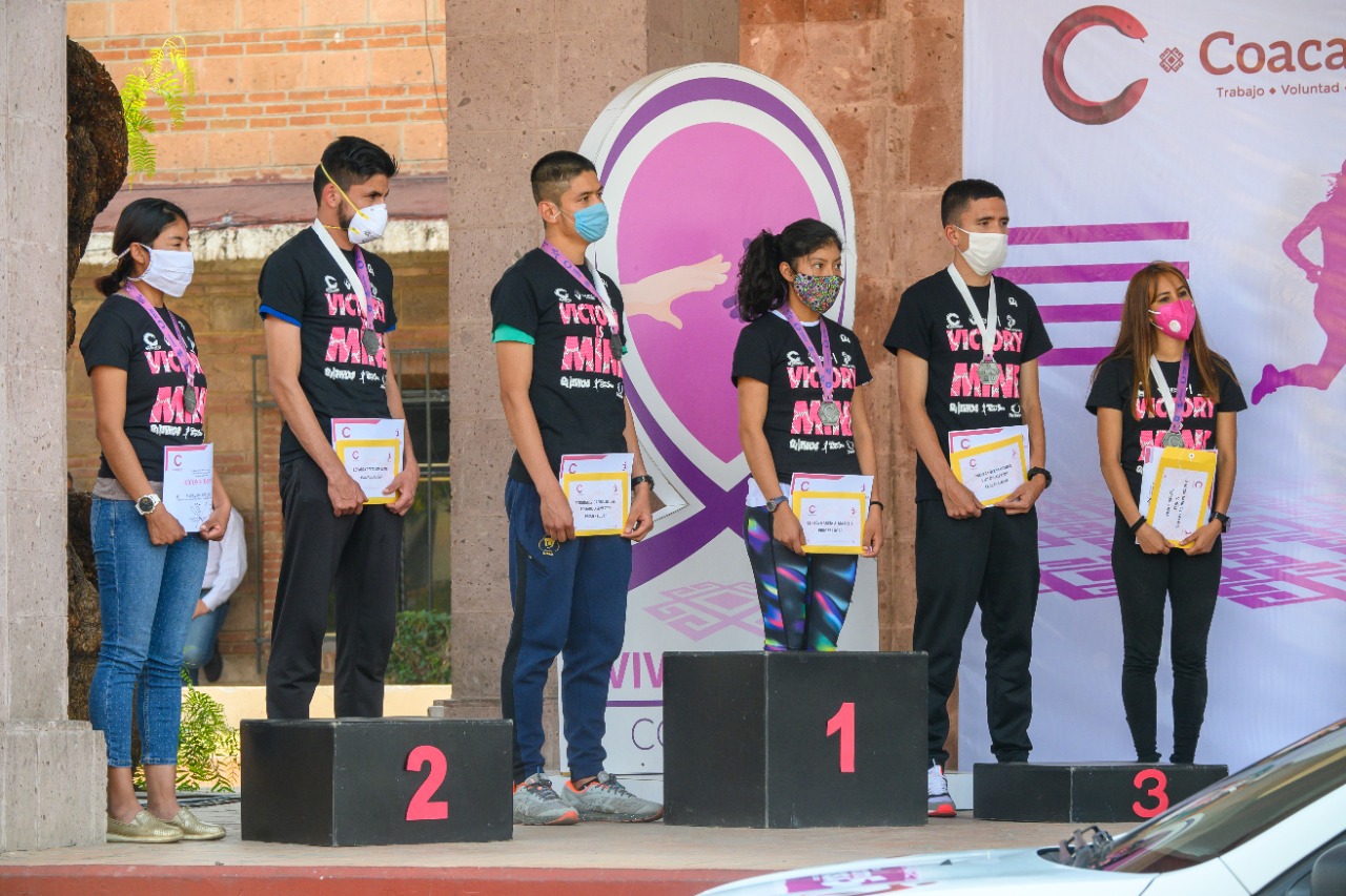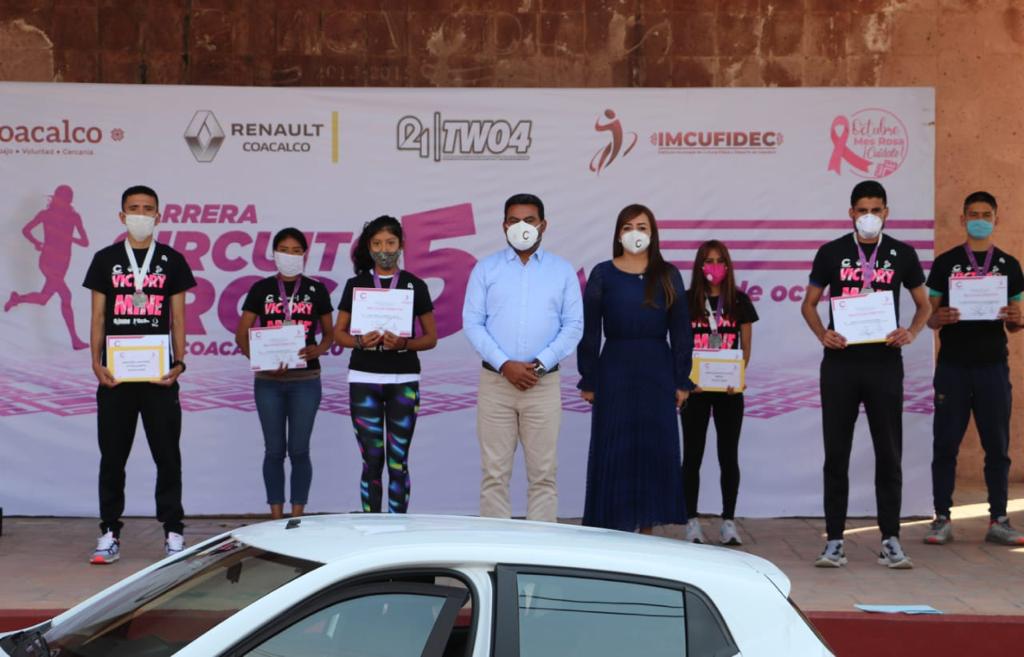 Coacalco, Méx.- El Alcalde Darwin Eslava entregó los premios a los tres primeros lugares en las ramas femenil y varonil de la carrera deportiva “Circuito Rosa”, la cual se realizó los días 17 y 18 de octubre con la participación de más de 500 corredores, a favor de la concientización para prevenir el cáncer de mama.