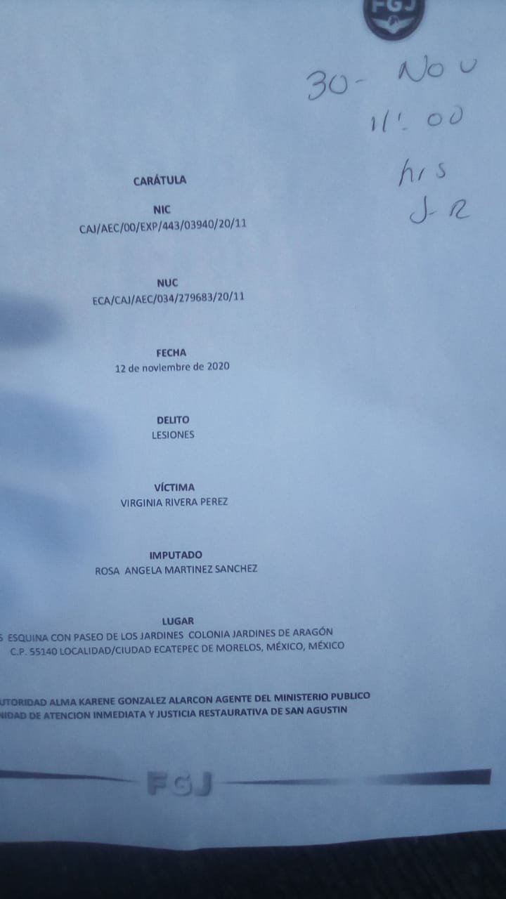 Los vecinos agredidos presentaron la denuncia en el e, pendiente CAJ/00/EXP/443/03940/20/11 y ECA/CAJ/AEC/034/27683/20/11, por el delito de lesiones, ante el Ministerio Público contra la delegada Rosa Ángela Martínez, y exigieron al Alcalde Fernando Vilchis que no permita la actuación impune de las autoridades auxiliares, que mueven a los policías a su capricho. Exigieron sean suspendidos y se les sanciones por su actuación.