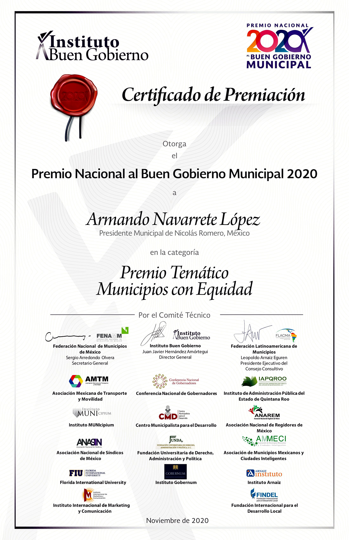 Nicolás Romero, Méx.- El alcalde Armando Navarrete López, fue reconocido con el Premio Nacional Buen Gobierno Municipal, Edición 2020, por el impulso que su administración le imprime desde el inicio de este trienio, a las políticas públicas a favor de la equidad y en contra de la discriminación.