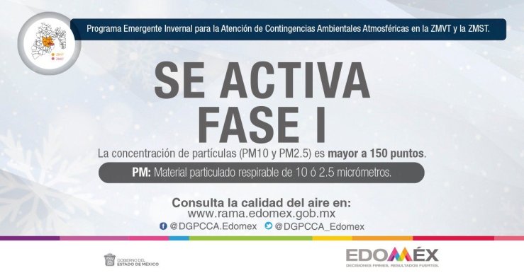 Las acciones en Fase I por partículas suspendidas fracción PM2.5 se activan en cumplimiento al Acuerdo por el que se establece el Programa Emergente Invernal para la Atención de Contingencias Ambientales Atmosféricas en la Zona Metropolitana del Valle de Toluca y la Zona Metropolitana de Santiago Tianguistenco, publicado el 22 de diciembre de 2020, en el Periódico Oficial Gaceta del Gobierno.