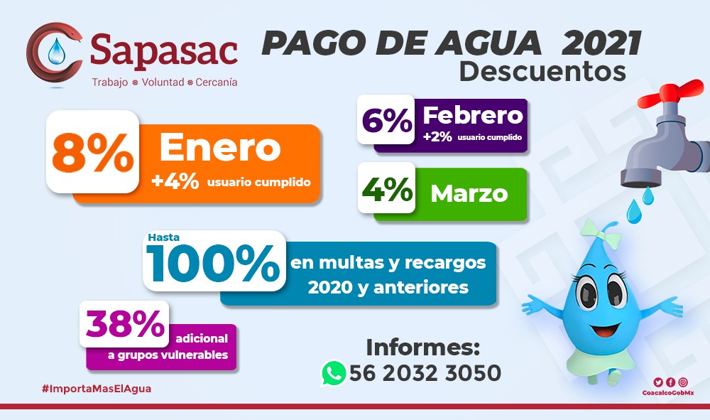 Durante la 90 sesión de Cabildo se aprobaron las siguientes bonificaciones, que aplicará el organismo descentralizado Sapasac a favor de las y los coacalquenses: por pronto pago las bonificaciones son de 8, 6 y 4 por ciento para los meses de enero, febrero y marzo respectivamente.