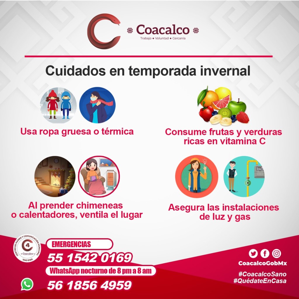 Coacalco, Méx.- Ante la onda gélida que se presenta en esta temporada invernal, el Gobierno de Coacalco presidido por el Alcalde Darwin Eslava extiende algunas recomendaciones a la población, para evitar infecciones respiratorias que se puedan complicar con el virus SARS-CoV-2.