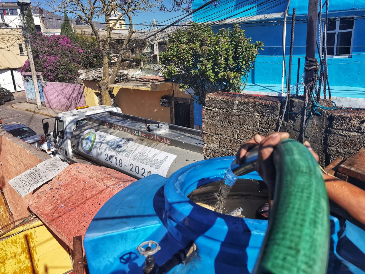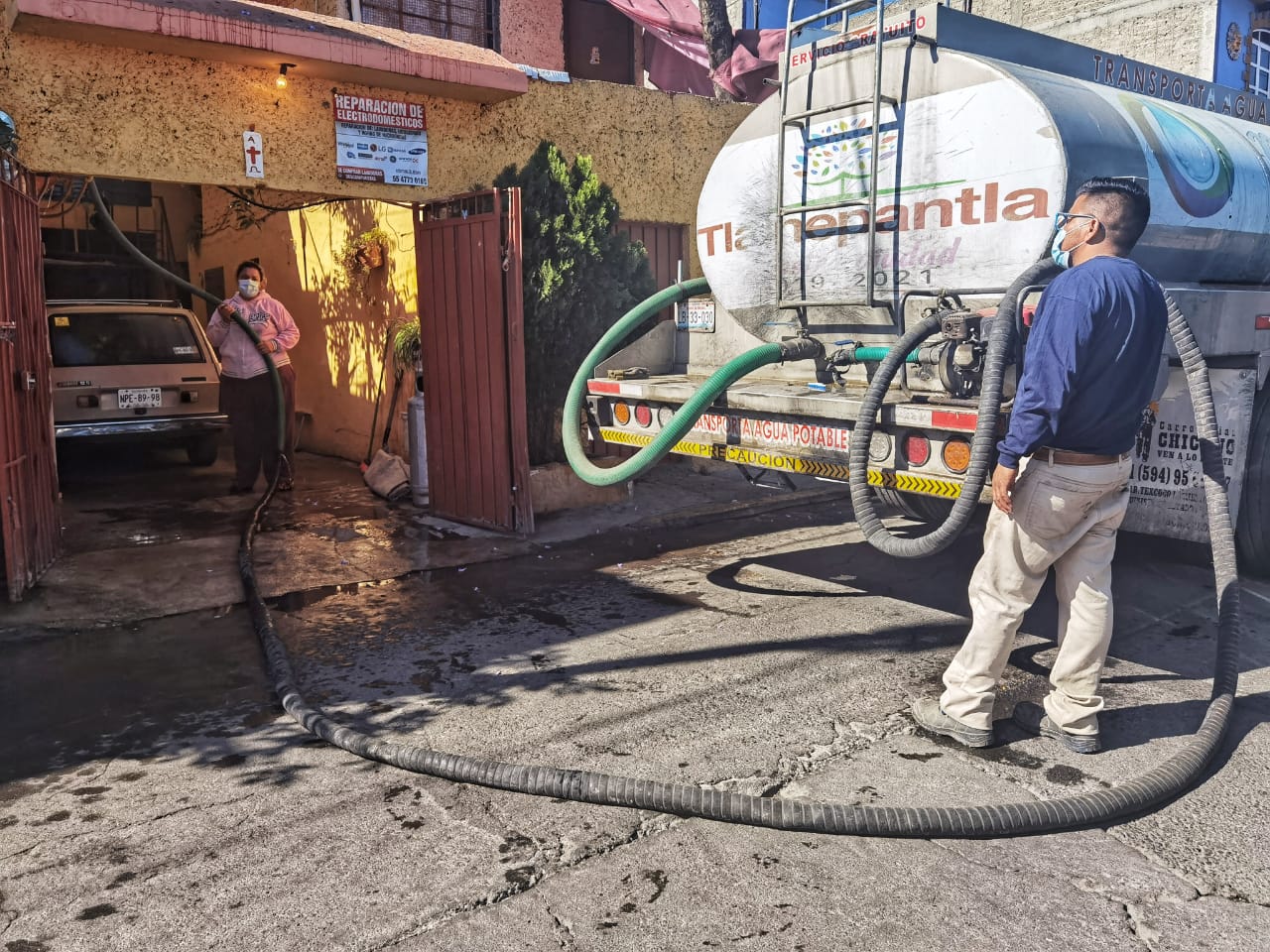 Con camiones cisterna el OPDM realiza recorridos por calles del pueblo San Juan Ixhuatepec donde se reportó baja presión para suministrar del vital líquido.