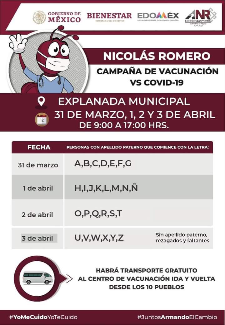 El gobierno de Nicolás Romero informa que la vacunación de los adultos mayores contra Covid-19 iniciará el próximo miércoles 31 de marzo y concluirá el sábado 3 de abril.