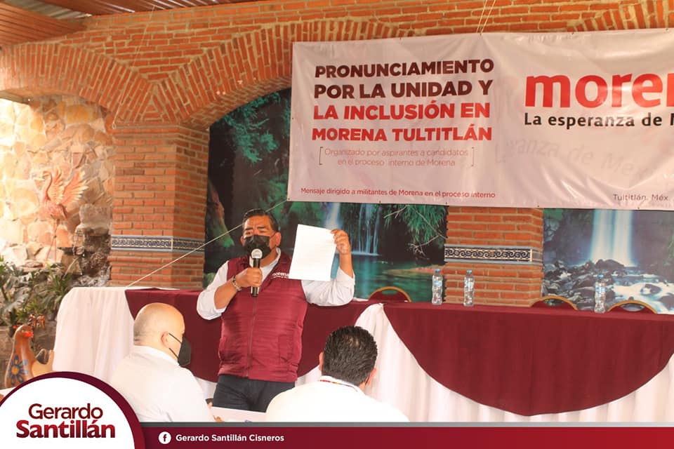 Gerardo Santillán, aseguro que en Tultitlán no hay un grupo hegemónico que los represente, ni un vocero o dirigente que hable por ellos, se dicen integrantes del Movimiento de Regeneración Nacional y estar comprometidos con sus principios y sus causas, a respetar el resultado del proceso interno, donde están seguros se valorará la trayectoria y compromiso de los aspirantes y se considerará el método de encuesta para la selección de los mejores perfiles para la definición de candidatas y candidatos, privilegiando la unidad con inclusión y construir juntos el próximo proceso electoral en favor del cambio verdadero.