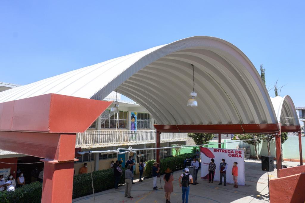 El Alcalde Darwin Eslava entregó los arcotechos de la primaria “Rosario Castellanos” y el jardín de niños “Mariano Azuela”.