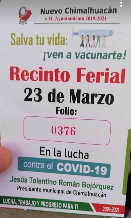 En los boletos entregados se invita a la población de adultos mayores a recibir la vacuna y al final, se aprecia la leyenda “En la lucha contra el Covid19, Jesús Tolentino Román Bojórquez, Presidente Municipal de Chimalhuacán”.