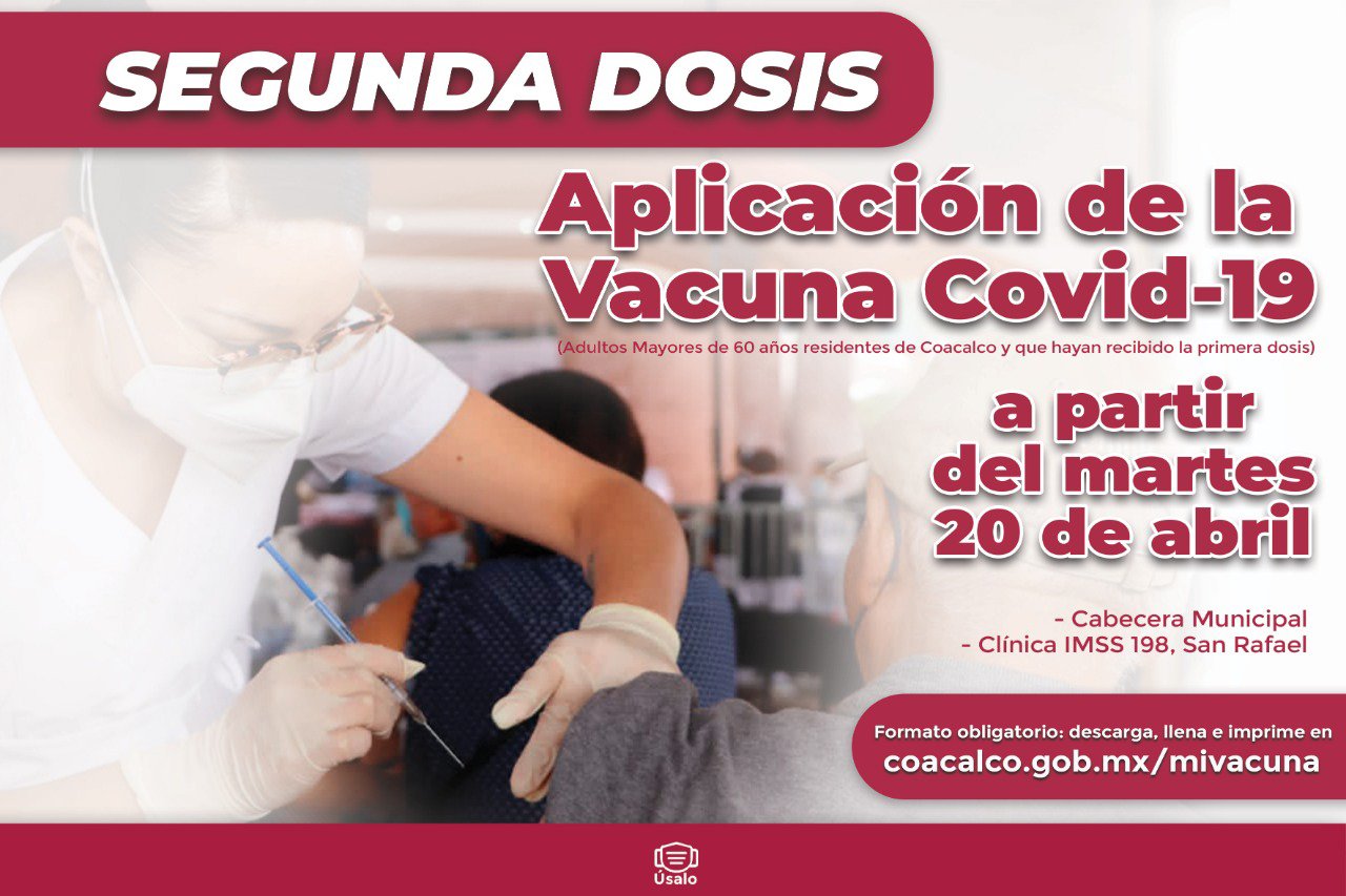 Coacalco, Méx.- El martes 20 de abril inicia en Coacalco la aplicación de la segunda dosis de la vacuna contra el Covid-19, a personas mayores de 60 años y que hayan recibido la primera dosis.