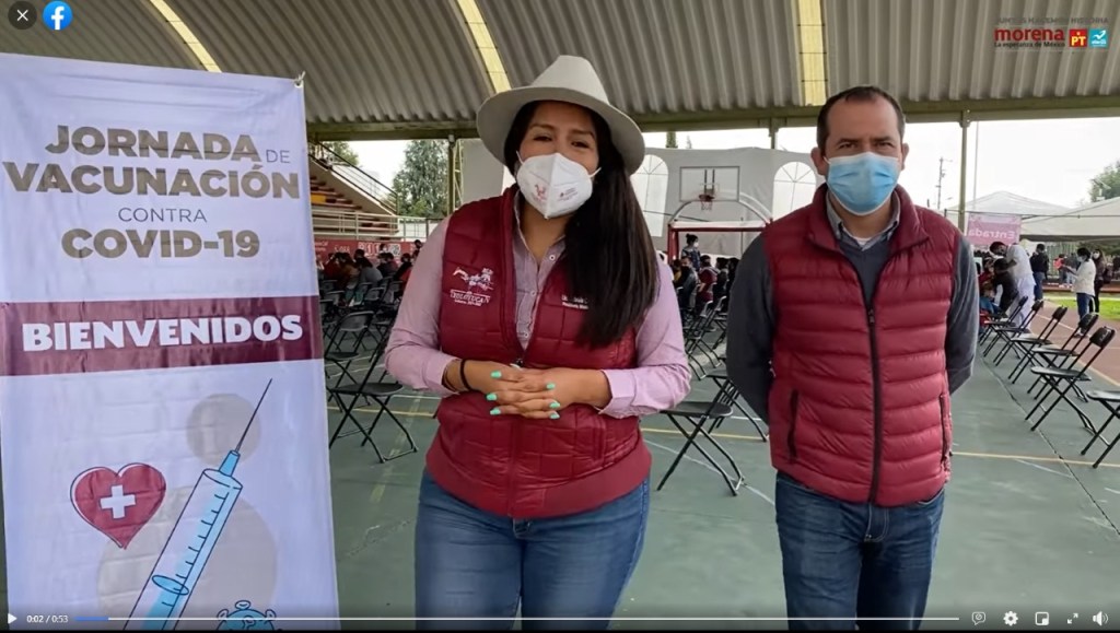 Teoloyucan, Méx.- Contraviniendo las indicaciones del gobierno federal de no darle un uso político a las vacunas contra el COVID-19, la presidenta municipal de Teoloyucan Gabriela Contreras Villegas, utilizó la jornada de vacunación para personas de 40 a 49 años para difundir un video a través de sus redes sociales sobre la colocación de vacunas al pueblo de Teoloyucan, video donde se muestran claramente los logotipos de los partidos Morena, PT y Nueva Alianza, lo que constituye un delito por la indebida utilización de propaganda gubernamental.