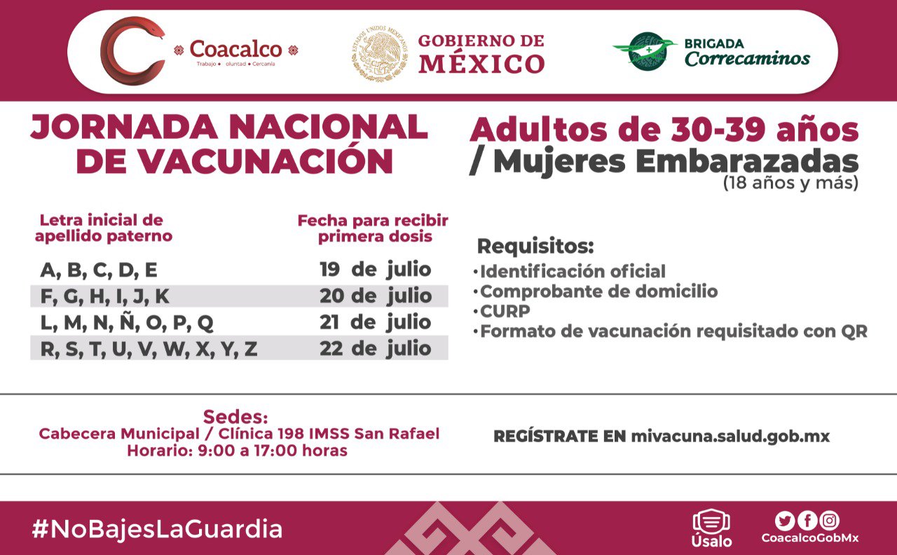 COACALCO, Méx.- El Gobierno de Coacalco informa que del lunes 19 al jueves 22 de julio se realizará la Jornada Nacional de Vacunación para las y los coacalquenses que pertenezcan al segmento de la población de 30 a 39 años y se continuará con el grupo de mujeres embarazadas mayores de 18 años con nueve semanas o más de gestación.