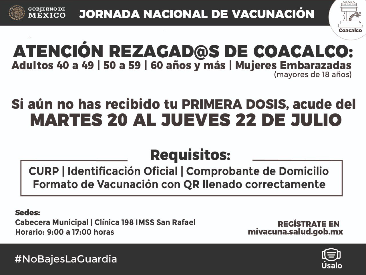 Coacalco, Méx.- A partir de este martes 20 y hasta el jueves 22 de julio todas las y los coacalquenses rezagados que aún no reciben la primera dosis contra el COVID-19 (incluye 60 y más, 50-59 y 40-49) podrán recibirla en las dos sedes habilitadas: Cabecera municipal y la Clínica 198 del IMSS, ubicada en San Rafael.