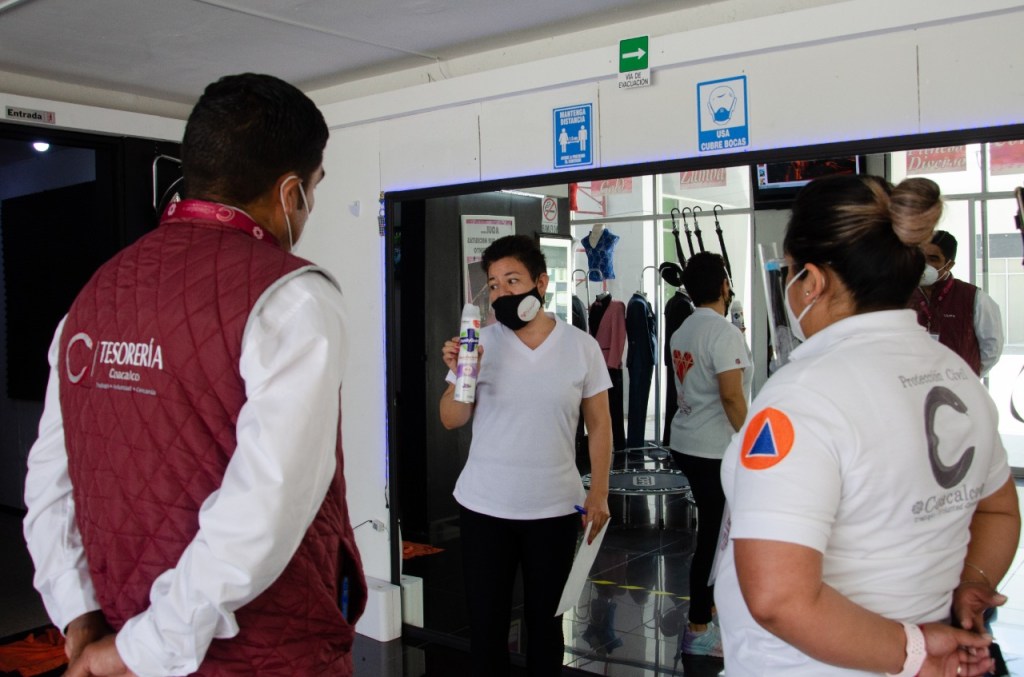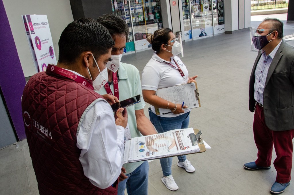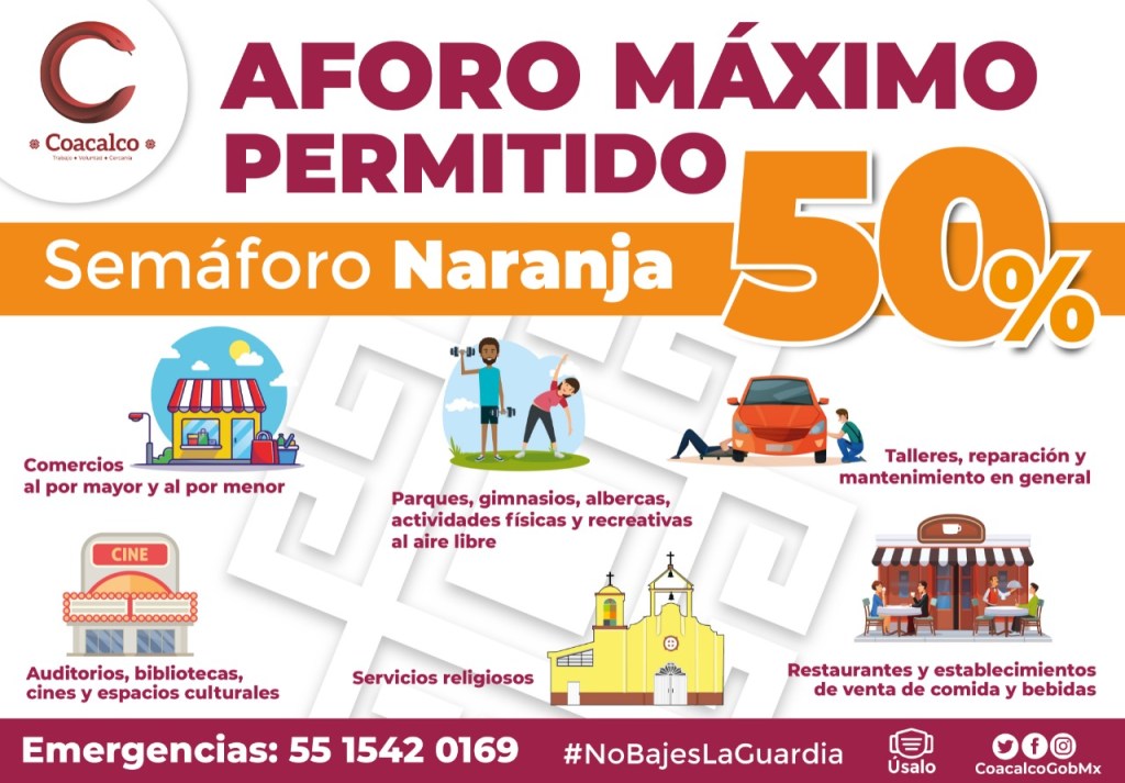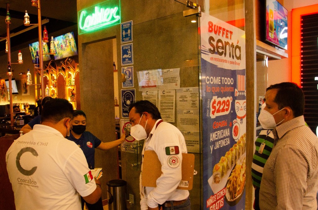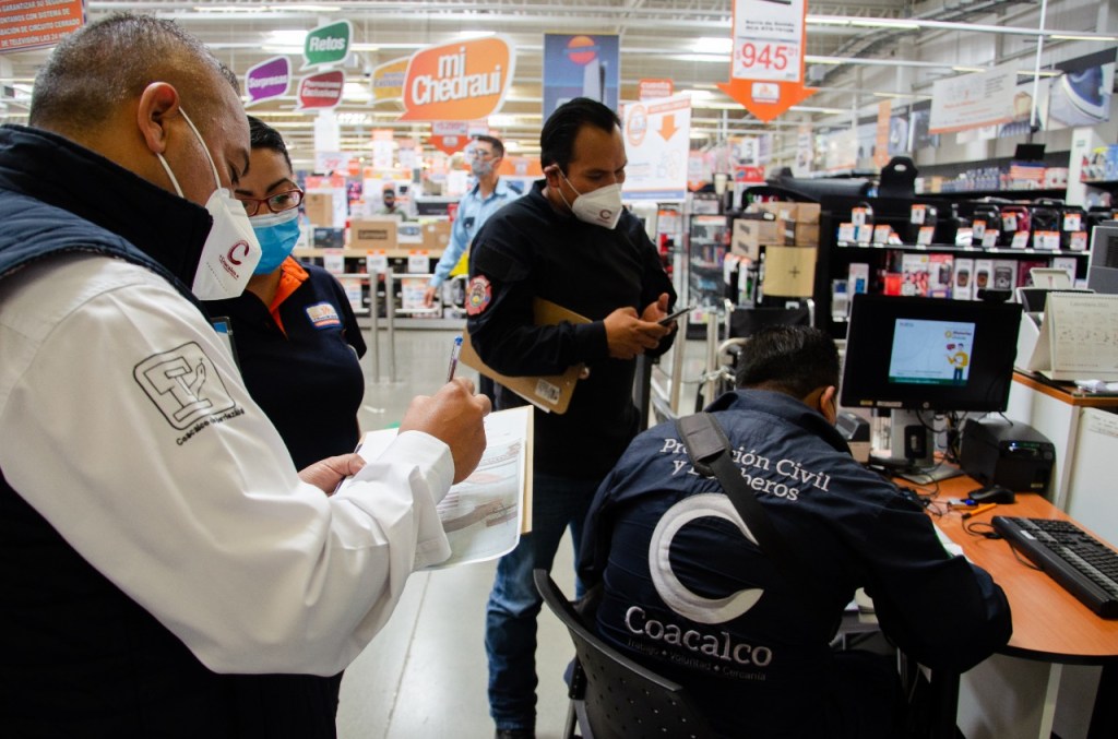 Integrantes de la Coordinación de Protección Civil y Bomberos y de Normatividad recorren comercios, plazas y centros comerciales de la localidad para dar a conocer las disposiciones publicadas en la Gaceta Municipal y, hasta el momento, se han visitado las plazas comerciales como Cosmopol, Plaza Las Flores, Multiplaza Coacalco, Zentralia, Plaza Coacalco, Power Center, así como unidades económicas de todo el municipio.